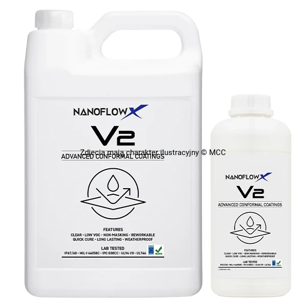 Powłoka zapewnia ochronę klasy IP67/IP68, jest bezpieczna dla złączy i może być aplikowana bez maskowania. Dzięki szybkiemu procesowi aplikacji (zanurzenie + utwardzanie cieplne) NanoFlowX V2 stanowi nowoczesną alternatywę dla tradycyjnych powłok konforemnych stosowanych w elektronice.