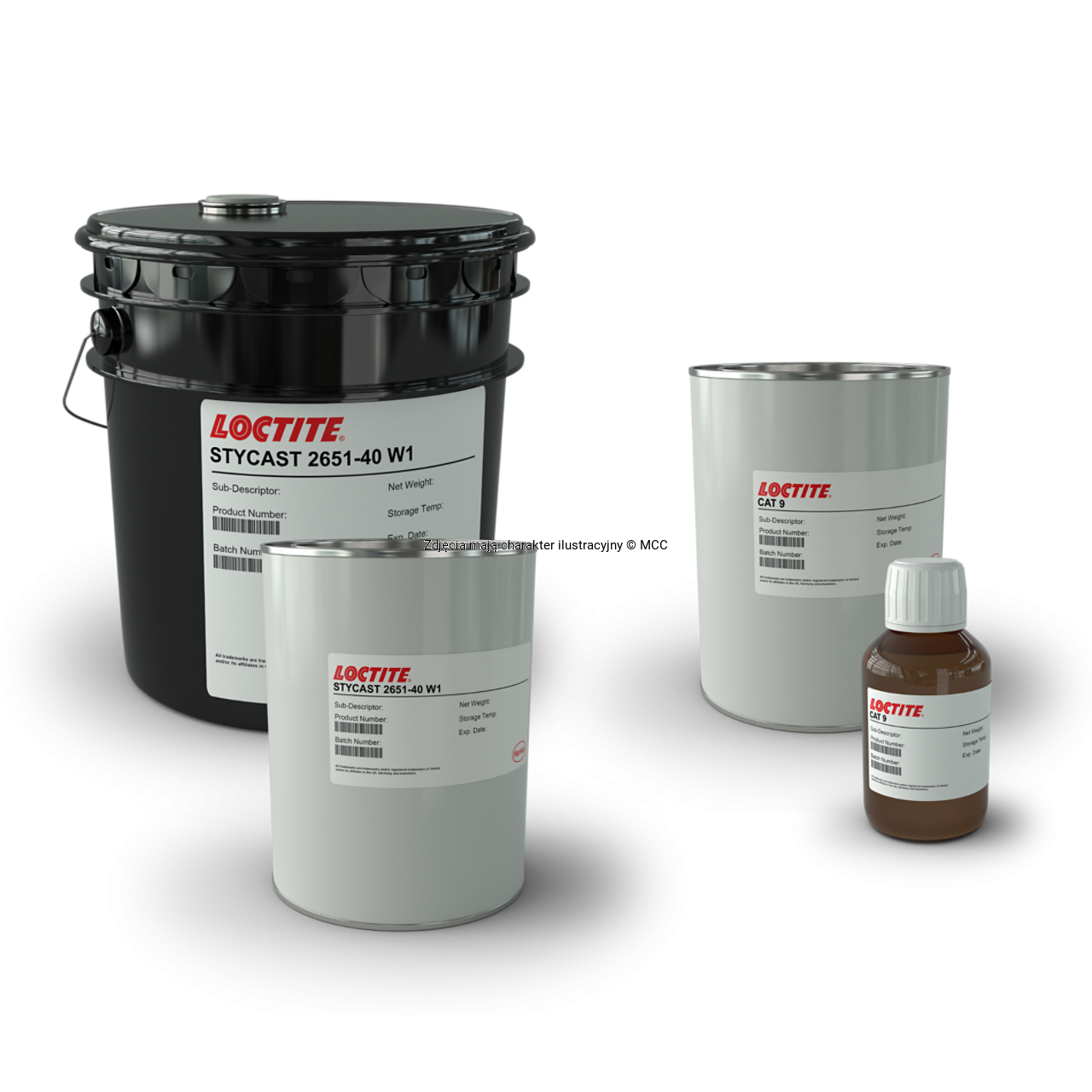 LOCTITE STYCAST 2651-40 W1 może być stosowany z różnymi utwardzaczami (np. CAT 9, CAT 24LV, CAT 27-1), co pozwala dopasować proces utwardzania oraz właściwości końcowe materiału do konkretnych wymagań technologicznych.